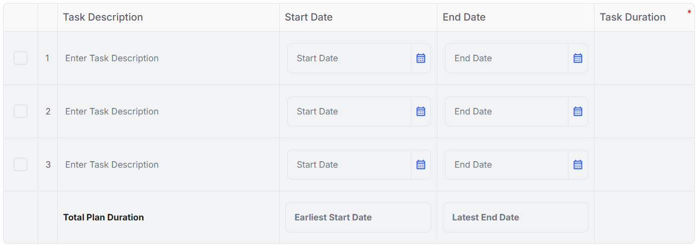 Note that a maximum of 30 rows can be added below. The Total Plan Duration must be less than or equal to 730 days, which equals two years.